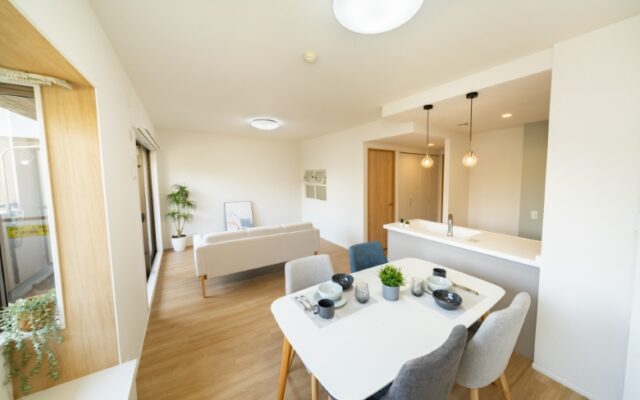 お部屋から望む緑を活かすため、白を基調に、やさしい色合いの床・建具・アクセントクロスを取り入れ、統一感のある空間に仕上げています。