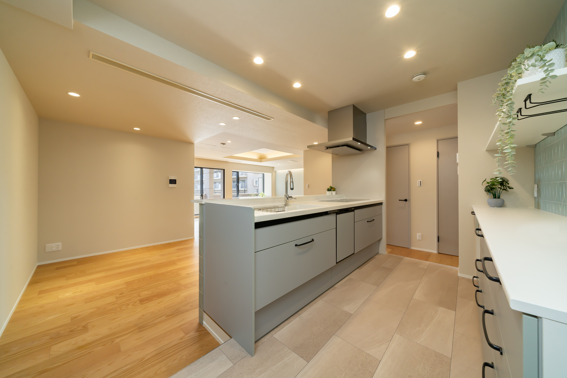 キッチン廻りの壁を取り払い、対面キッチンに。タイルのデザインで、リビングとトータルコーディネートした空間は、テーマカラーのセラドングリーンで、安らぎと平穏、静けさを感じる場所へ。