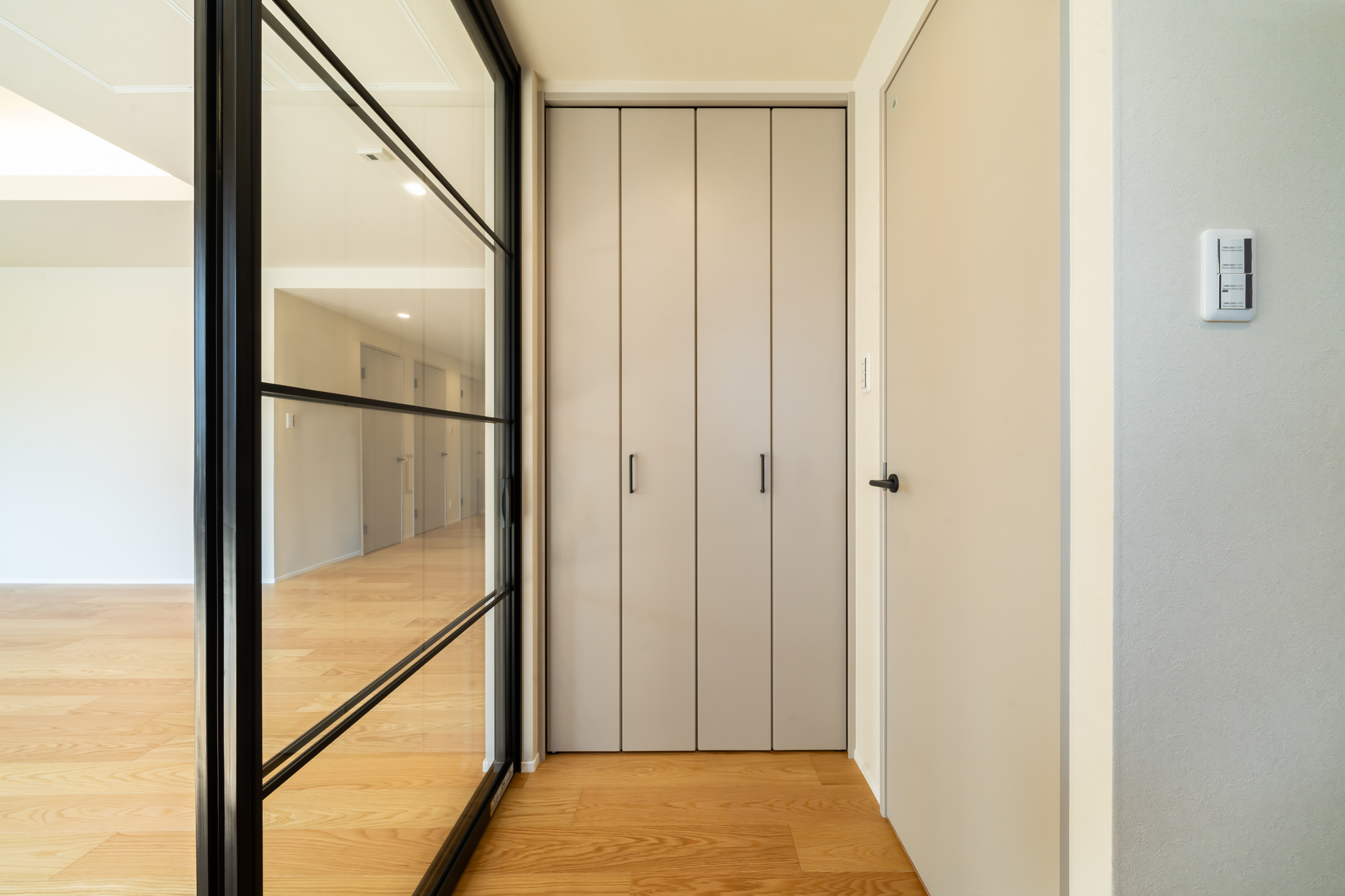 玄関からリビングへ通じる入り口は、フレームタイプのガラスドアで、リビングと開放的に空間を繋いでいます。リビングは間接照明で柔らかな癒しの空間に。