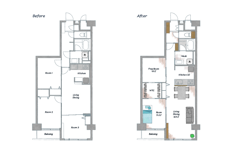 閉塞感があったキッチンを開放的な対面に配置変更して、LDKに一体感が生まれました。