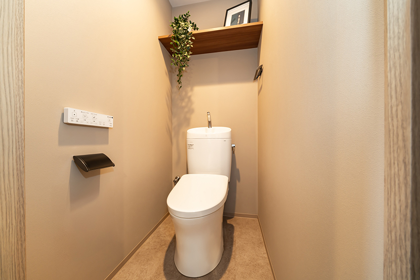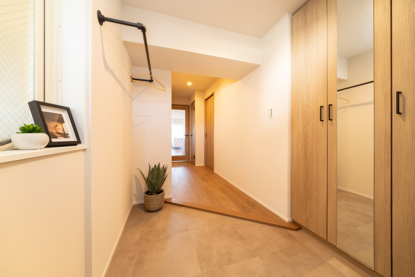 トールタイプの玄関収納で収納量を確保。壁付けのコートハンガーと広げた土間部分にはベビーカーなどもそのまま置ける実用的なスペースを設けました。玄関に奥行ができたことで使い方にも幅が生まれました。