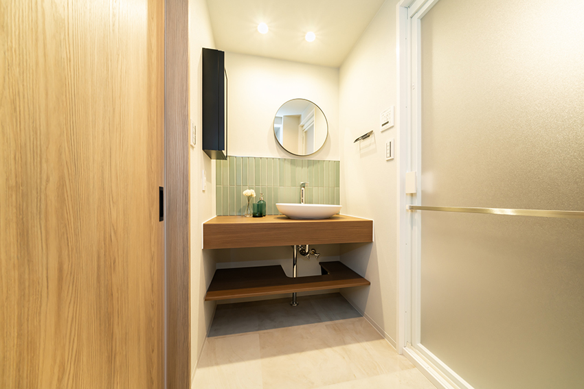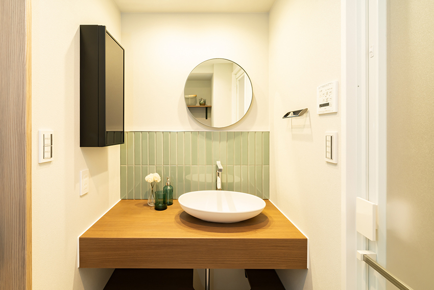 既製品ではなく、素材やバランスにこだわった造作洗面台を採用。使いやすさはもちろん、身支度の時間も心地よくなる空間に。タイルは平田タイルのFarbe FRB-ALを使用。シンプルでありながらツヤ感のあるミントグリーンで旬な雰囲気を演出しています。
