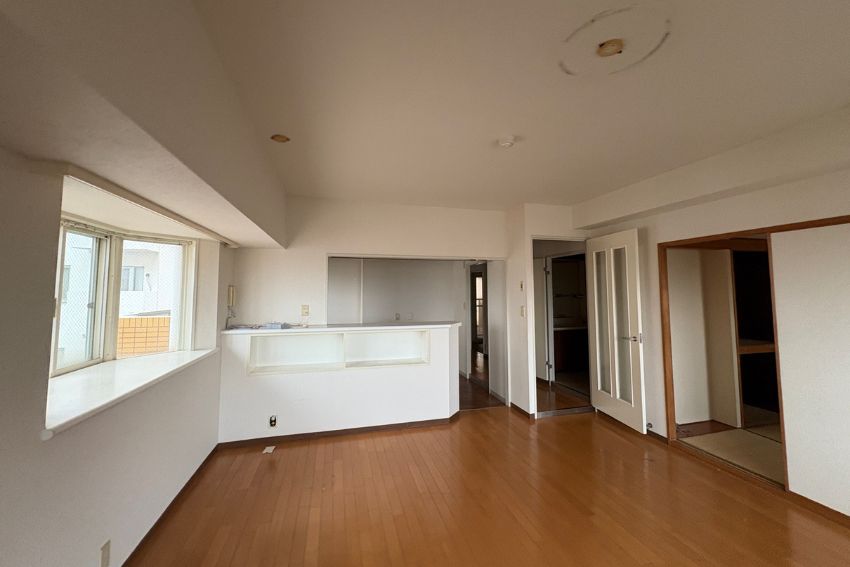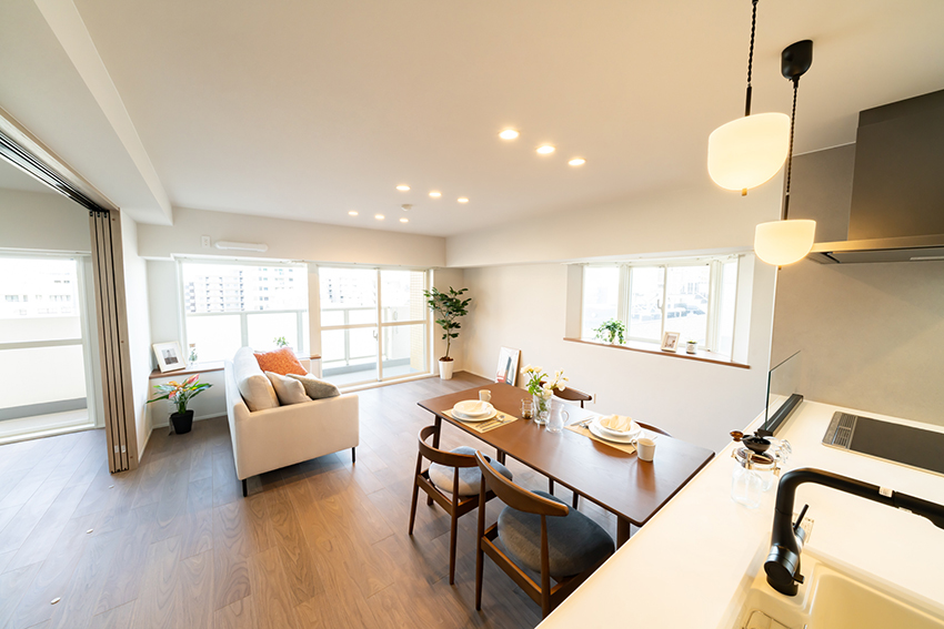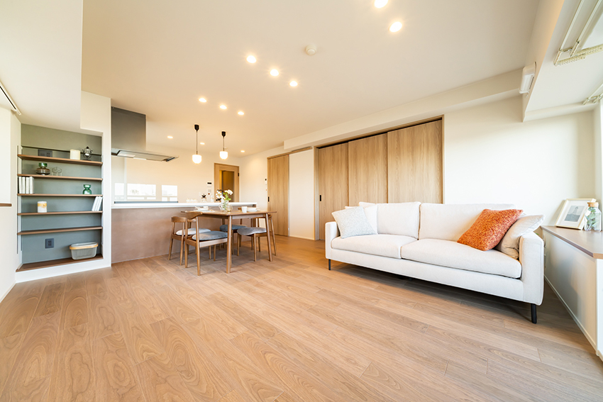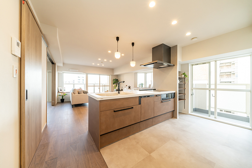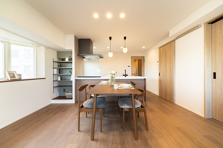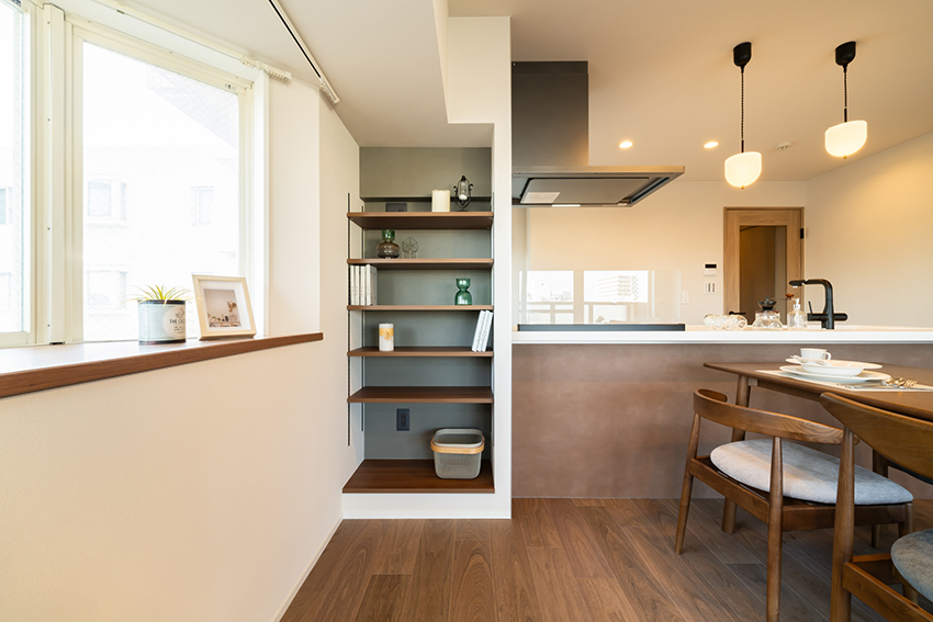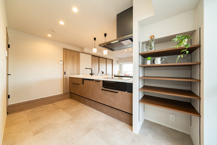 キッチンの吊戸棚をなくし、LDKとの一体感が生まれました。キッチンの横にはダイニング・キッチンからそれぞれ使えるオープン収納を備え付けました。