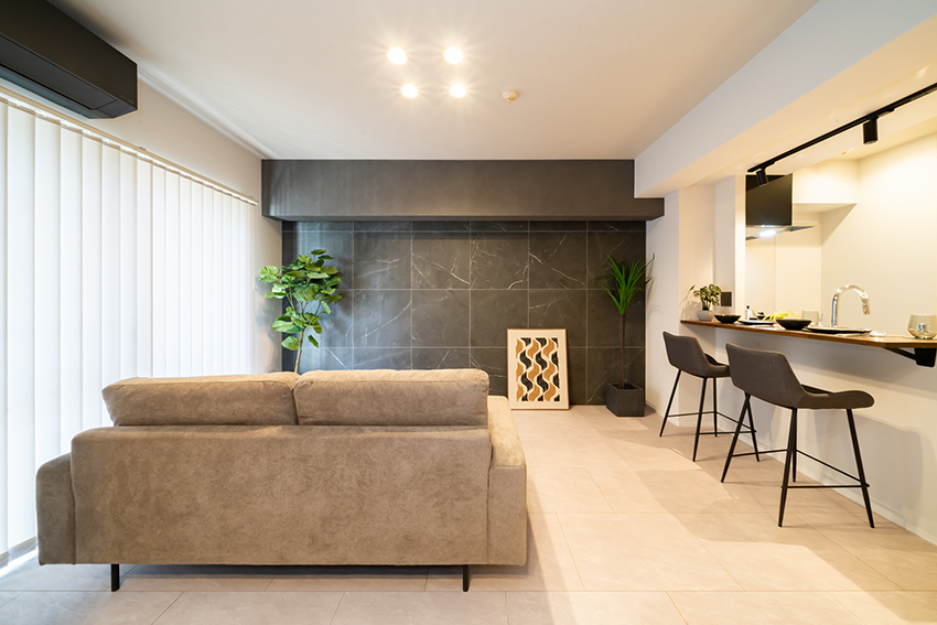 - リビングのアクセントになるタイル壁 -