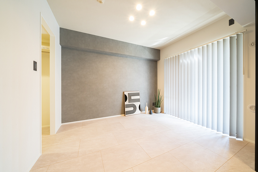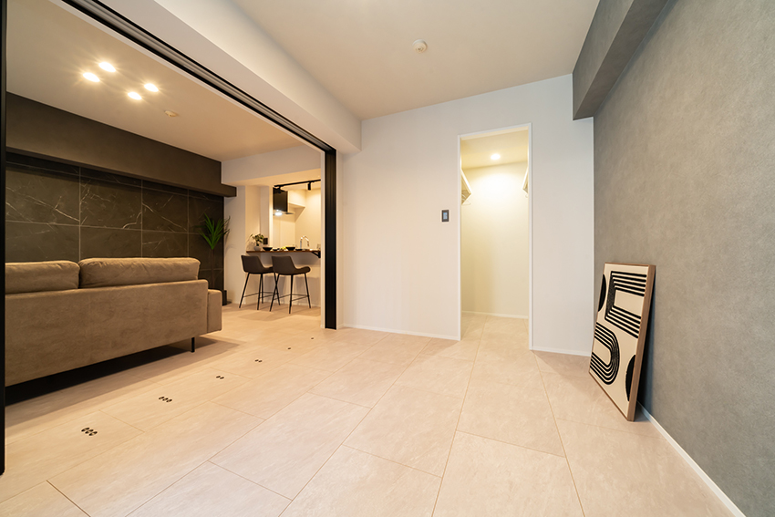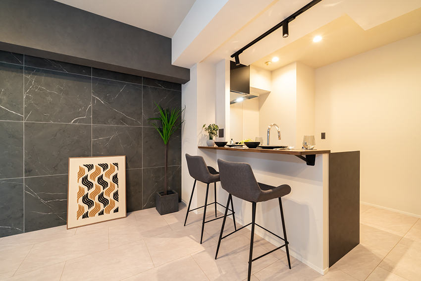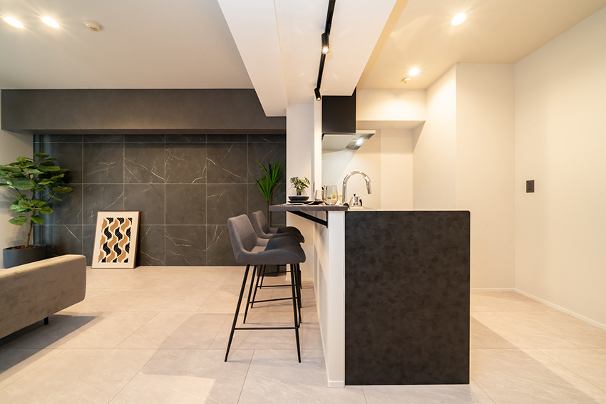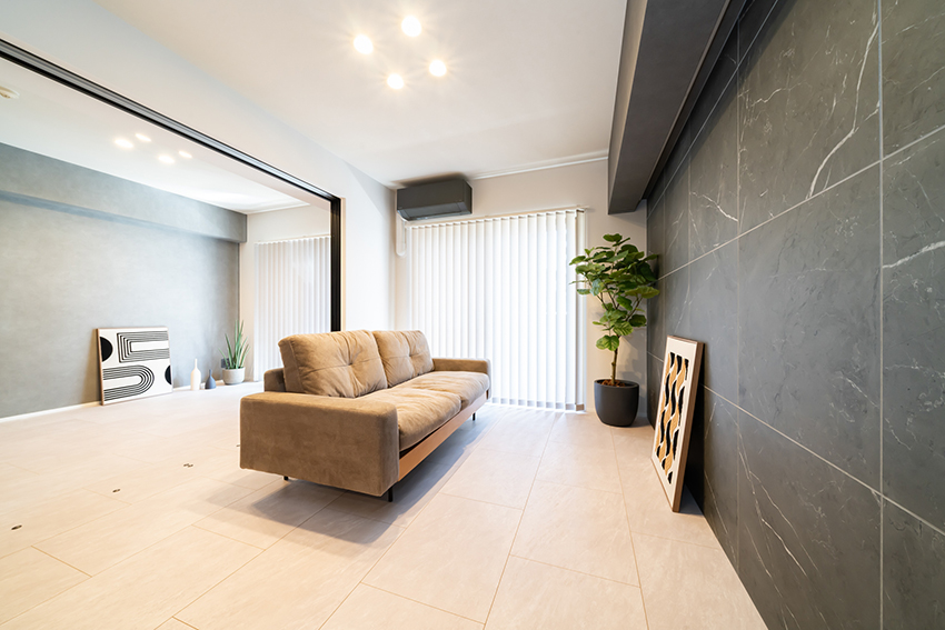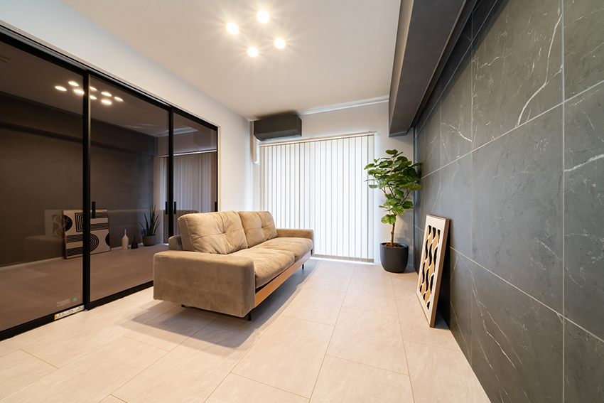 リビングの壁面一面にタイルを施工(平田タイル Nove NVE-6060G-NAT)。素材感のあるマーブル模様のタイルが空間のアクセントとなり、高級感のある上質なリビングに仕上げました。また、コーニス照明を取り入れ、光の陰影が空間をおしゃれに演出します。