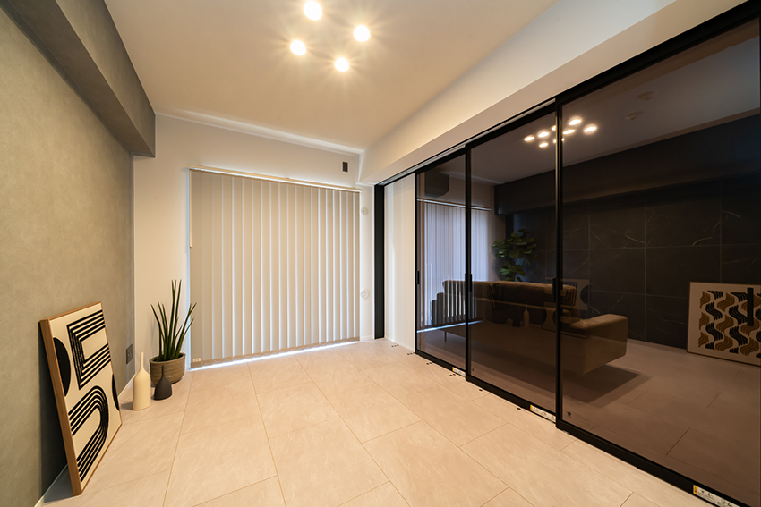 リビングの入口と寝室との間仕切ドアにフレームドアを採用(YKKap ファミットG)。ガラスの抜け感が空間に広がりをもたらし、モダンで洗練された印象を演出しています。