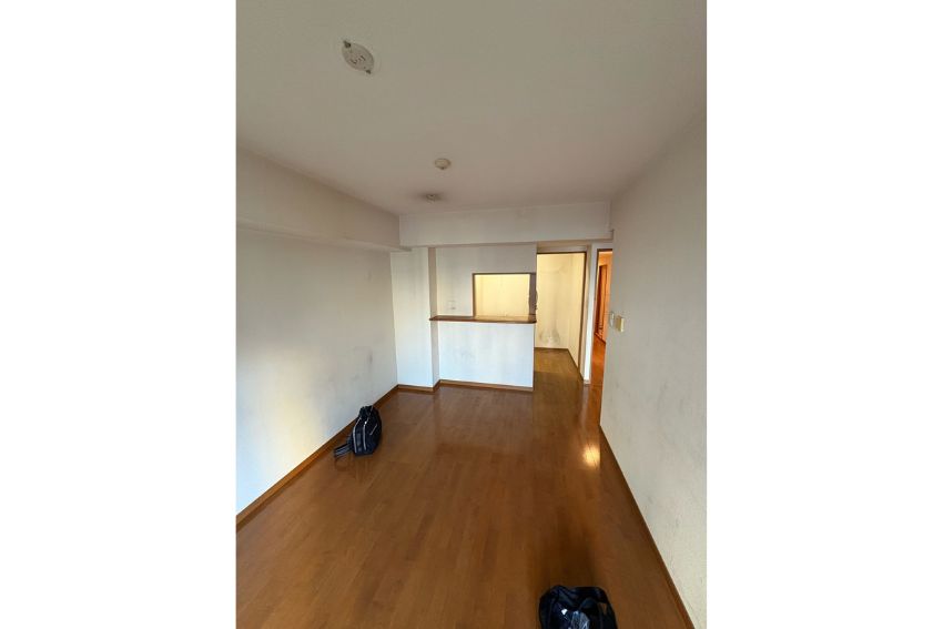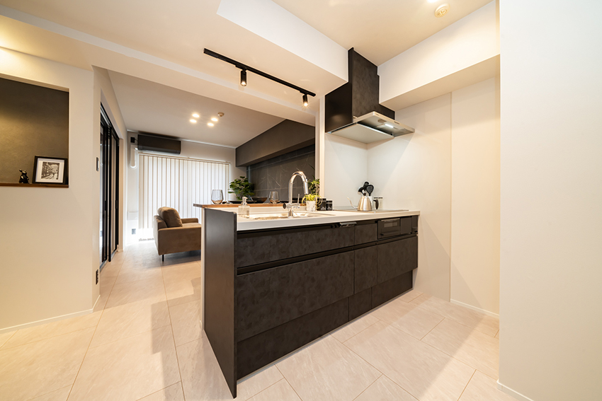 対面キッチンの吊戸棚を撤去することで視界が抜け、リビングとつながる開放的な空間に。すっきりとした印象になり、LDKがより広く感じられるようにしました。