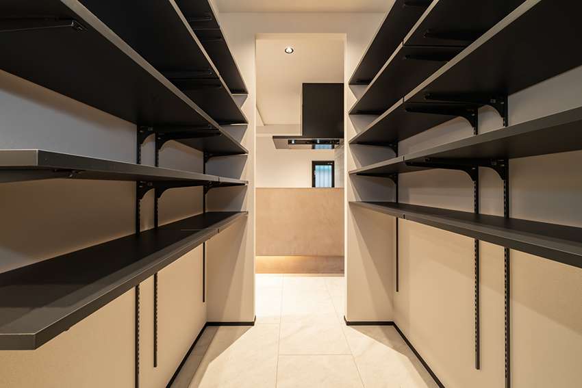 玄関→パントリー→洗面室ランドリー→キッチン→ダイニング