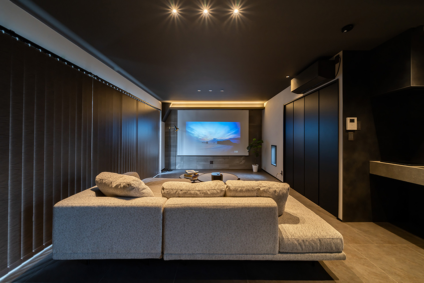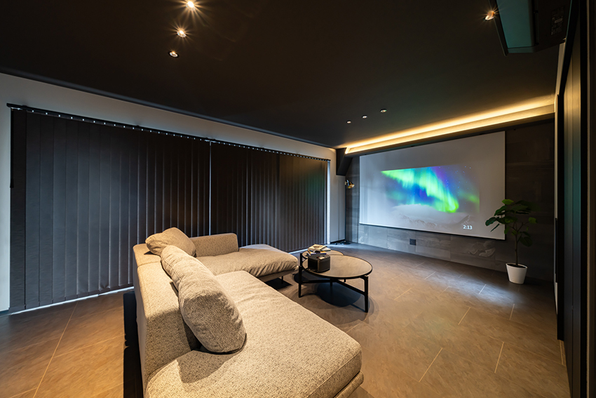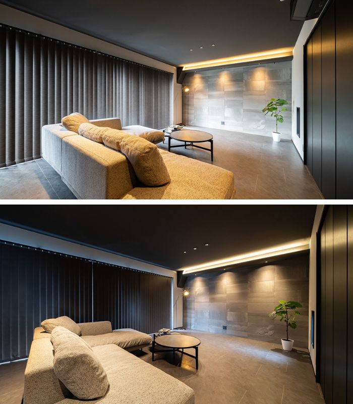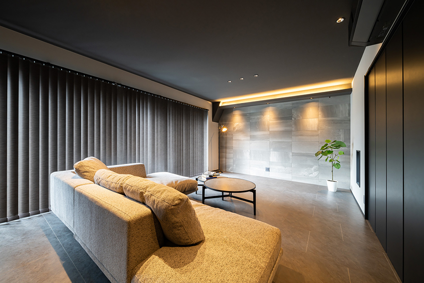 - タイル×間接照明で“陰影の主役壁”を形成 -